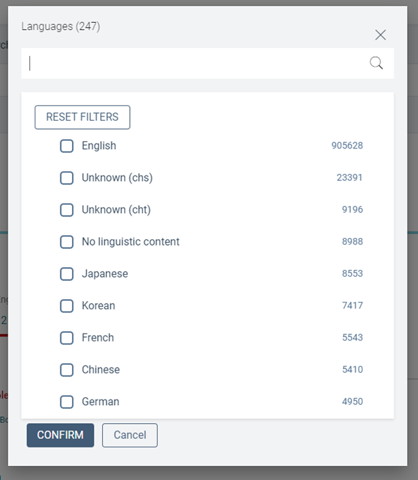 2. Then select the ‘Language’ filter to narrow your search results to Simplified Chinese or Traditional Chinese. Please note that the Chinese language filter is currently under construction, and you can only see the language codes [Unknown (CHS)] for Simplified Chinese and [Unknown (CHT)] for Traditional Chinese.