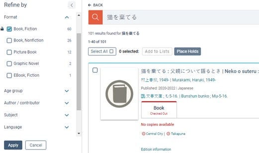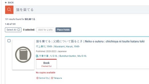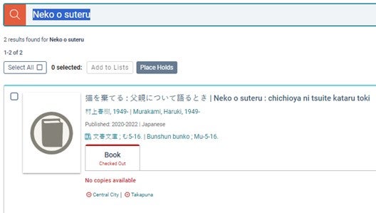 3. You can also search for a title or an author's name in Romanised characters. For example: Neko o suteru= 猫を棄てる
