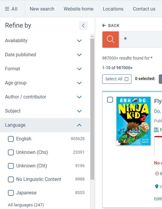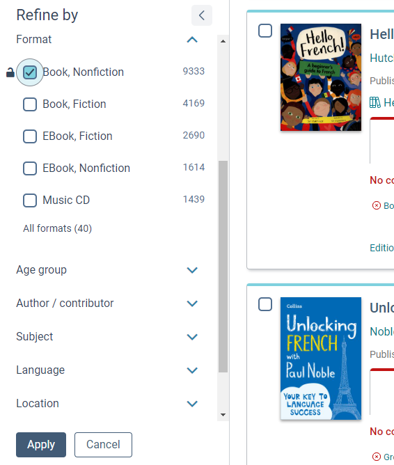 5. To narrow your search results, go to the Refine by section to select filters such as Format, Age group, Language or Subject.
