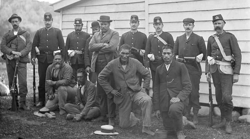 Police guarding the arrested Māori leaders at Rawene during the 'Dog Tax War', 1898. Auckland Libraries Heritage Collections 1572-0425.