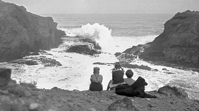 Diamond family and stray dog watching the surf at The Gap, Piha, 1953. Auckland Libraries Heritage Collections JTD-04E-00037-2.