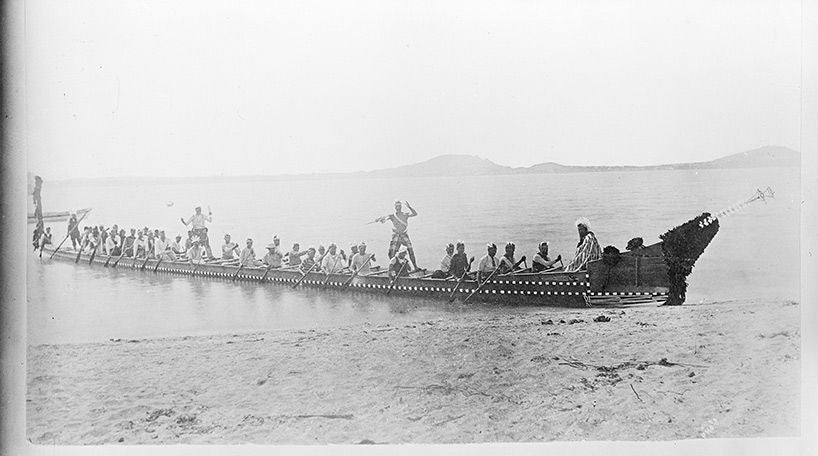Waka taua (war canoe) of Paora Tuhaere, Orakei. Originally photographed mid-1880s by the Pulman Photographic Studio, it was later copied by James D Richardson. Auckland Libraries Heritage Collections 4-1597.