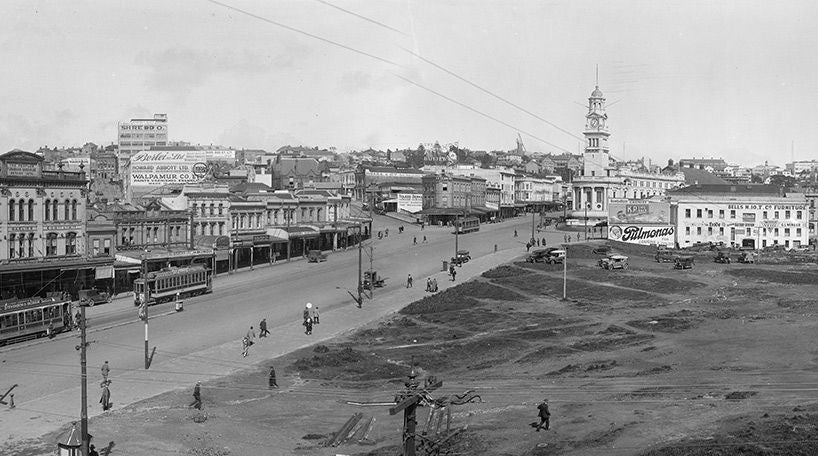 Queen Street and Civic Square, Auckland, 1927. Auckland Libraries Heritage Collections 1-W0819-PAN (cropped).