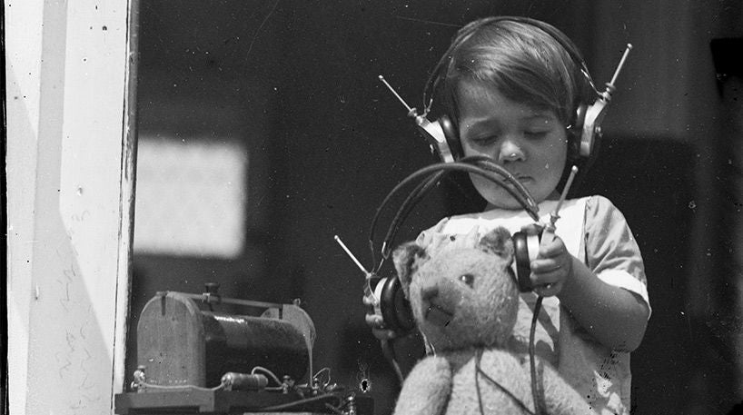 Robert Emirali and his teddy listening to a crystal set, 1928. Photographer Samuel Frith, Auckland Libraries Heritage Collections.