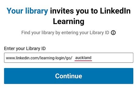 4. You will be asked to enter your library ID. Tap inside the field and type auckland at the end of the pre-filled link in the field. The field should show: www.linkedin.com/learning-login/go/auckland